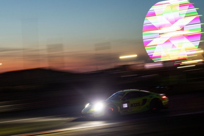 A key moment of the race arrived just as the sun was glancing the horizon, when Stefan Kiefer in the #94 Sante Royale Racing Team Porsche 992 GT3 Cup had been hit and spun at turn one, when all of a sudden Julien Andlauer in the #33 Falken Motorsports Porsche 992 GT3 R, who was in second position behind Güven in Grello, hit the stricken Porsche Cup, and had heavy damage to the front. This put an end to both of the Porsche’s races, and suddenly changed the dynamic as the race entered darkness.